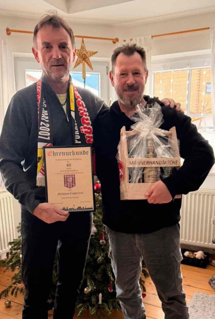 Jubilar Cyppi Beitrags-Autor:Redaktion Beitrag veröffentlicht:Januar 3, 2026 Beitrags-Kategorie:Allgemein Beitrags-Kommentare:0 Kommentare Armin Bleul besuchte am 02.01.2026 in Garmisch unser Langjähriges Fanclubmitglied Matthias Czyperreck und überreichte ihm in Namen vom 1.FCN Fanclub Schnaittachtal Urkunde und Erfrischungsgetränke für 40 Jahre treue Mitgliedschaft. Das könnte dir auch gefallen Grillfest 2024 Juli 17, 2024 Jahreshauptversammlung 2022 Juni 25, 2022 KANUFAHRT Blaibach 2023 August 22, 2023 Schreibe einen Kommentar Antworten abbrechenKommentierenGib deinen Namen oder Benutzernamen zum Kommentieren ein Gib deine E-Mail-Adresse zum Kommentieren ein Gib deine Website-URL ein (optional) Meinen Namen, meine E-Mail-Adresse und meine Website in diesem Browser für die nächste Kommentierung speichern. Δ